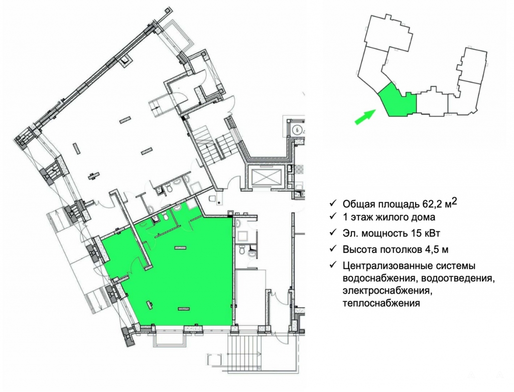 В помещении сделан ремонт. Высота потолков 4, 5 м., электричество 15 кВт.