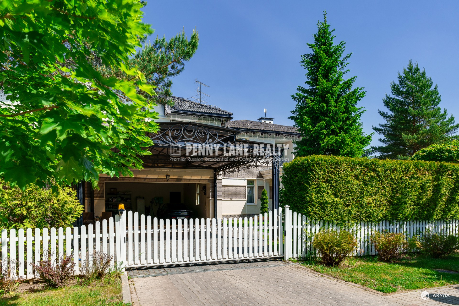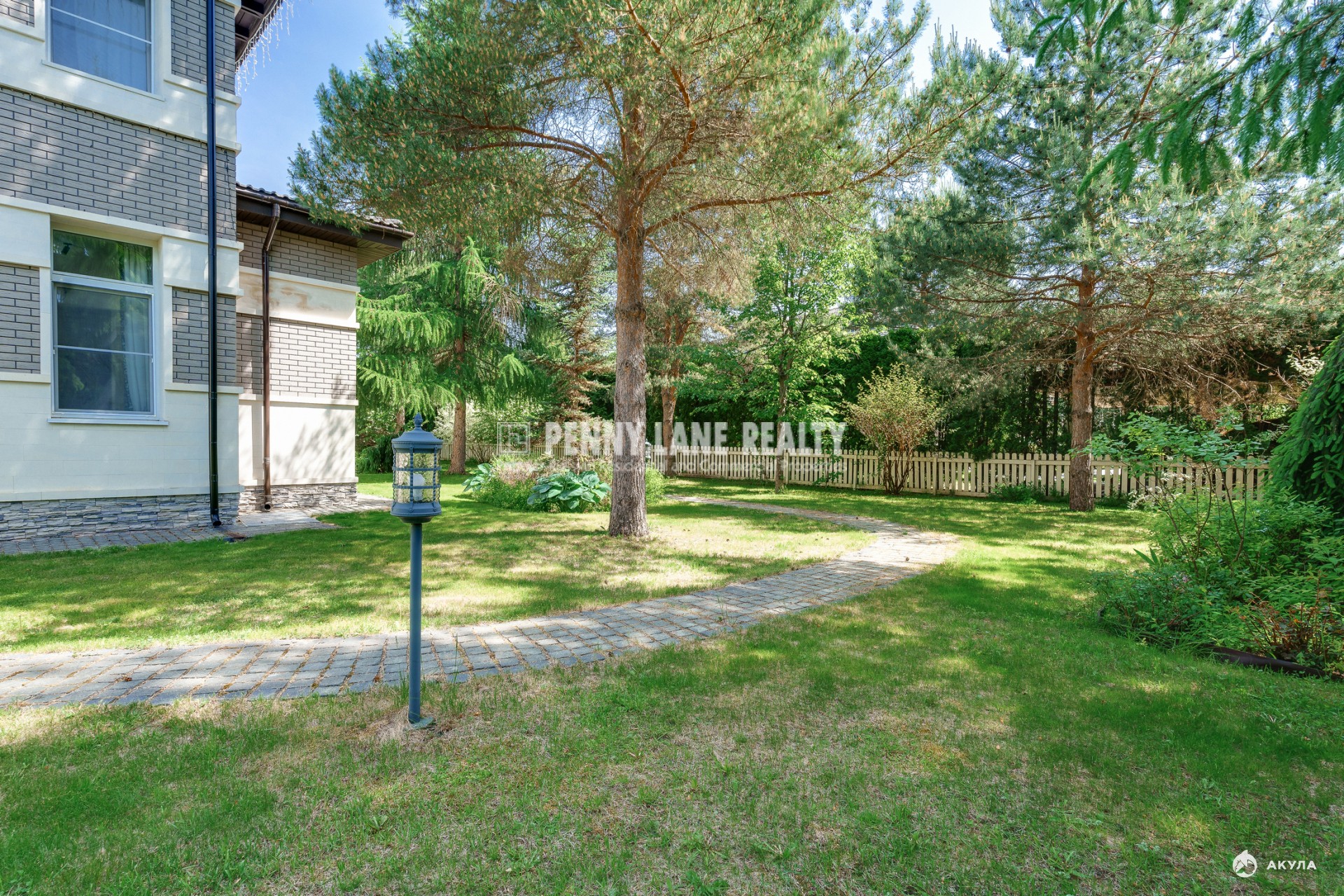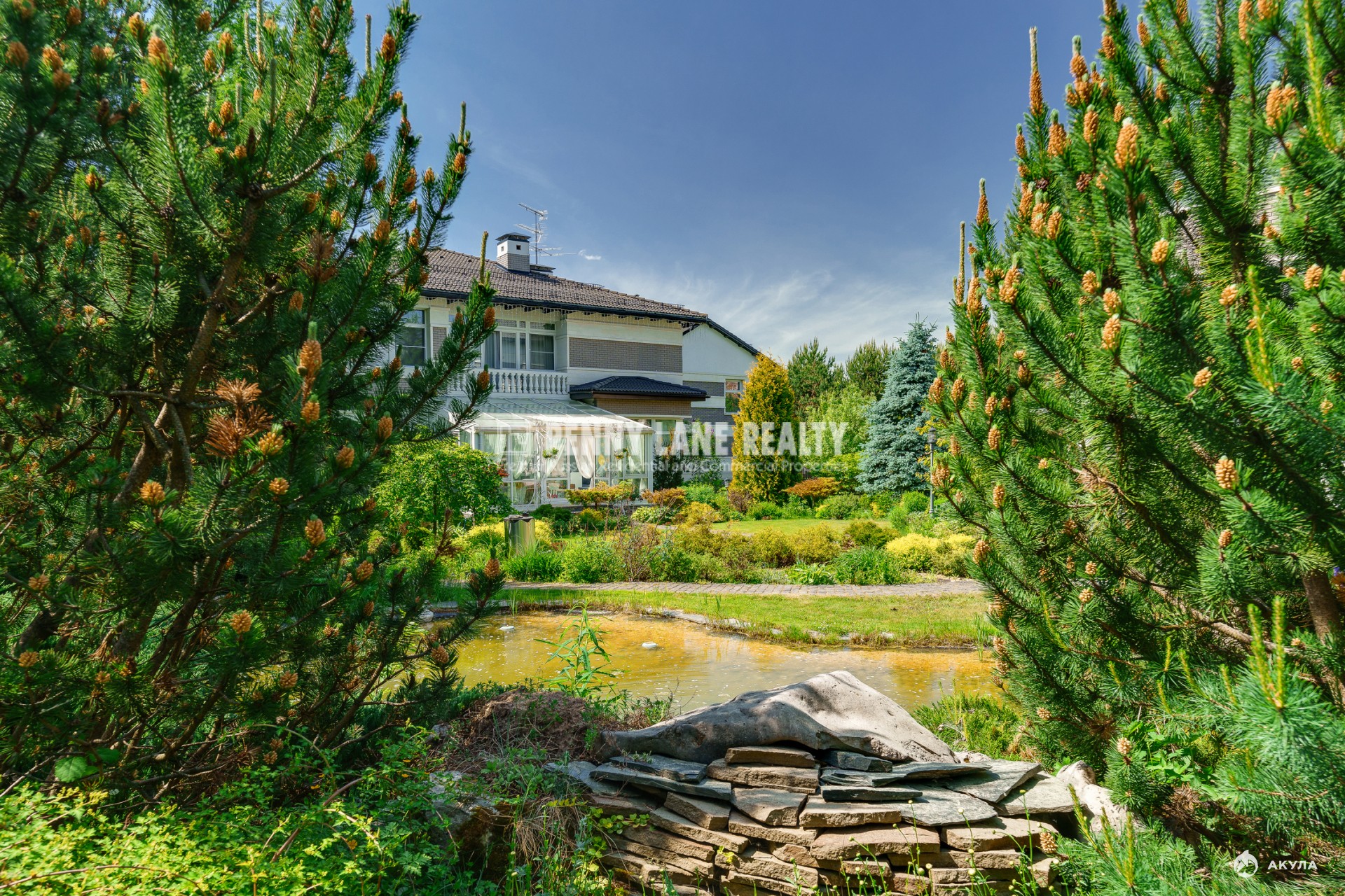 Площадь коттеджа составляет 630 кв.м., а на земельном участке площадью 30 соток расположен декоративный пруд. Участок оформлен с использованием ландшафтного дизайна, растений хвойных пород и включает зону для барбекю.