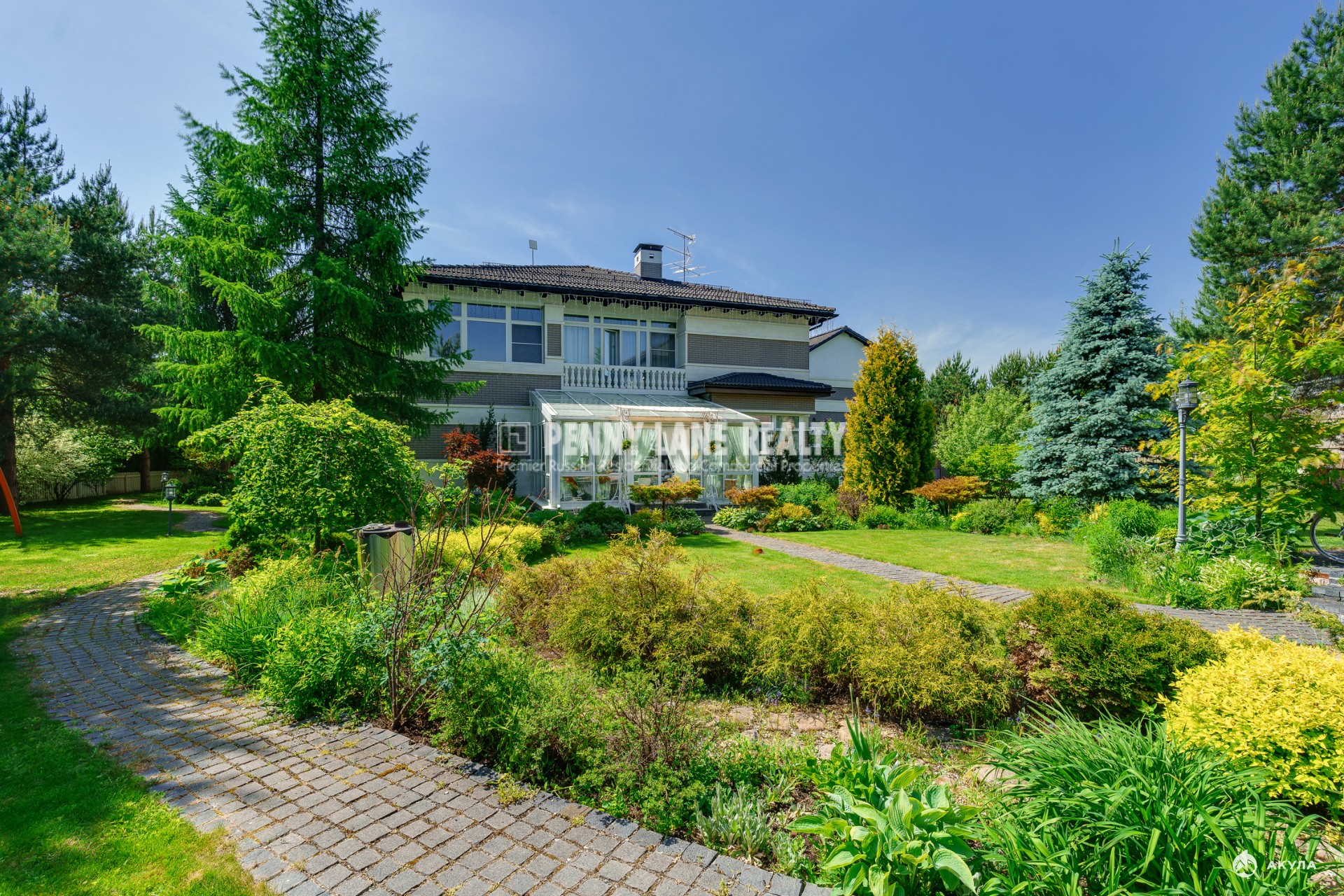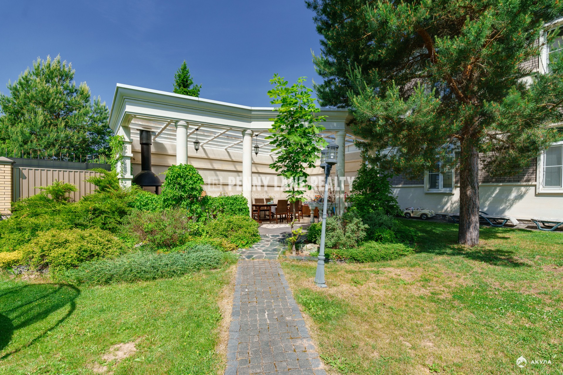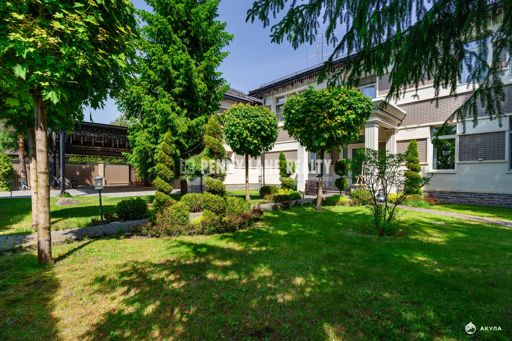 Площадь коттеджа составляет 630 кв.м., а на земельном участке площадью 30 соток расположен декоративный пруд. Участок оформлен с использованием ландшафтного дизайна, растений хвойных пород и включает зону для барбекю.