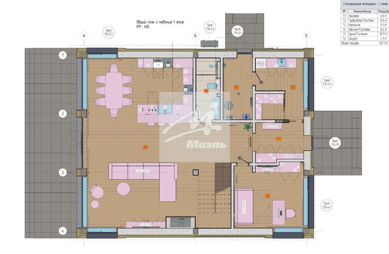 Планировка дома:на 1 этаже: прихожая, гардеробная, кухня-гостиная с дровяным камином 82 кв.м представляет собой единое пространство, с выходом на террасу; гостевая спальня или кабинет; с/у; бойлерная;на 2 этаже: холл, мастер-спальня 37 кв.м со своим санузлом и двумя гардеробными; две спальни; с/у.