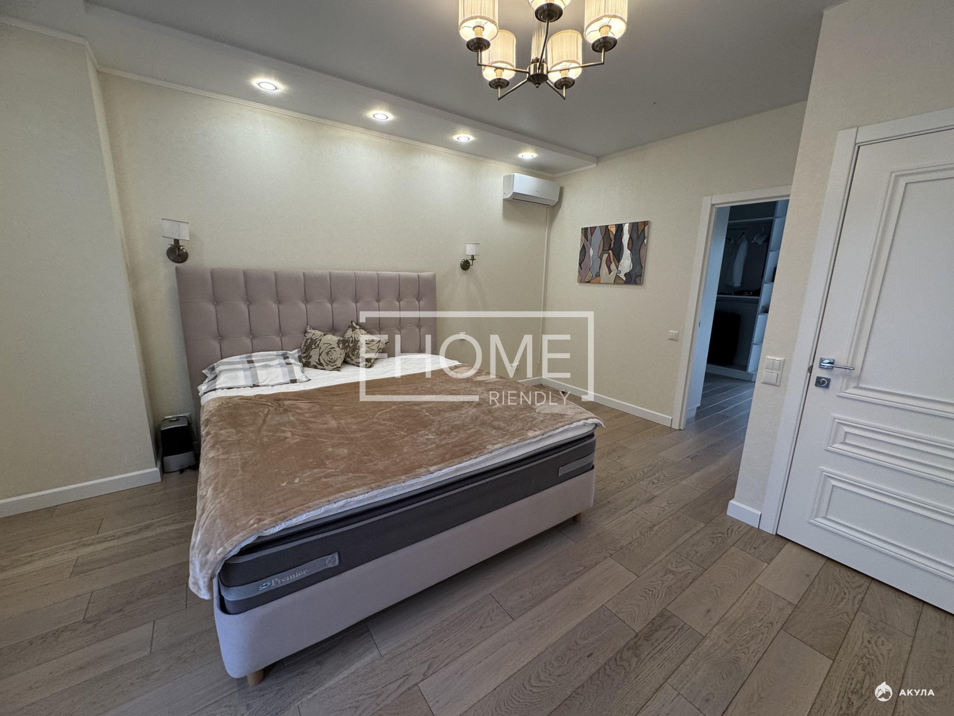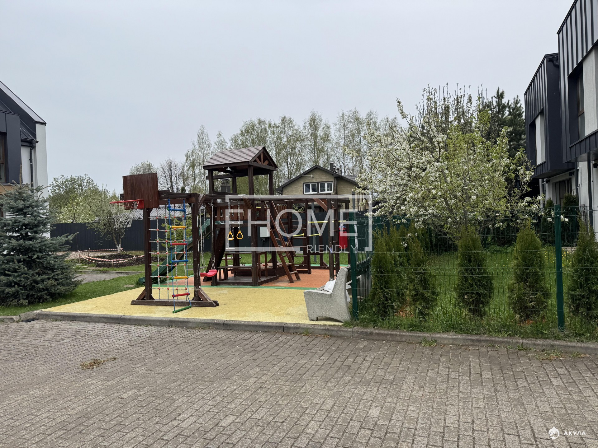 В доме на 1-ом этаже расположены: гостиная с кухней, комната под кабинет, прачечная и санузел. На втором этаже 2 спальни, просторная гардеробная и ванная комната. На 3 - ем этаже мансарда с двух-спальной кроватью.